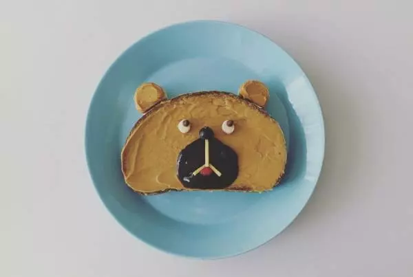 パンにピーナッツバターとチョコクリームを塗って、顔のパーツを乗せると「くまぱん」の完成。愛くるしい表情がなんともたまらない……♡ 同じ要領でいろいろな動物をつくってみるのも楽しそう!
