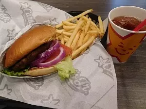 コンボセットは写真の通りドリンクとフレンチフライポテトが付いてくるのですが、ドリンクバーである点も嬉しいところ。コーラやオレンジジュース、アイスティーなどメニューも豊富です。カリフォルニア風のモダンなインテリアも相まって、ファーストフードと言えどもオシャレにくつろげるお店ですよ。