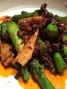 彩りのよさと香り、旬の食材を楽しみたいなら、炒めものもぜひ。この日、最初に頼んだ「卵とトマトの薫香炒め」がふわっと軽く、すぐに完食してしまったので、「アスパラガスと筍の香麻炒め」(季節限定メニュー)も追加オーダー。印象が全く違う炒めものが出てくるのが「mimosa」なので、食べ比べてみるのもここではあり!