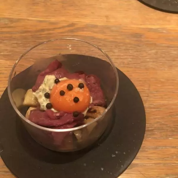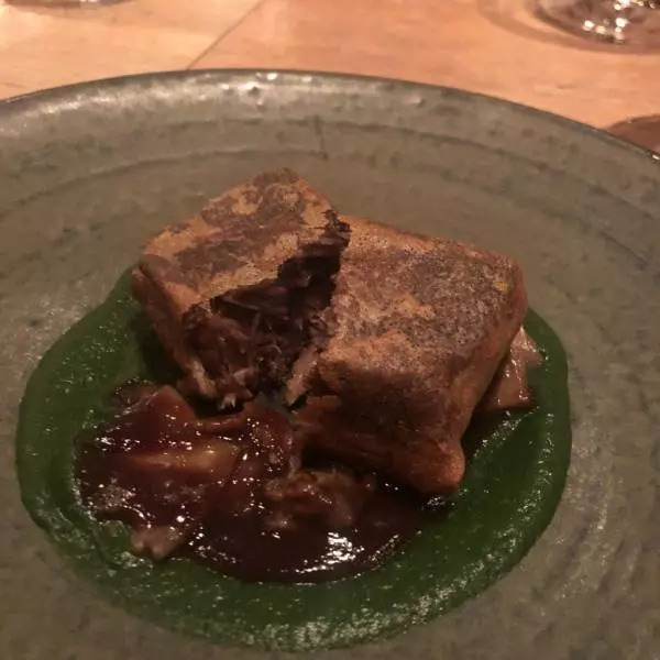 この日、何よりびっくりしたのが、エゾ鹿を使った冷前菜。正直、ジビエは苦手だったんですが、このレアな状態でも肉の臭みは一切なし!肉質も本当に柔らかくて、メニューを見なければ高級和牛と思ってしまうほどのクオリティ。食べるときは卵黄をつぶして、リンゴと根セロリ、ソテーしたマッシュルームにからめて鹿肉と一緒に。このひと皿のおかげで、苦手意識のあったジビエの印象を一変させてくれました。