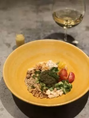 ひと皿目にいただいたのが、こちらのレストランのシグネチャーメニュー、「ティーリーフサラダ」。見た目の美しさにもテンションが上がりますが、福岡の八女茶を発酵させた茶葉に、きゅうりやトマト、ゴマやナッツ類など、10種類以上の食材を混ぜることで、ひと口ごとに違う味や食感が楽しめるのも魅力のひとつ。