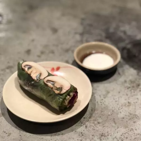 続いて運ばれてきたのがベトナム料理の定番、生春巻き。でも、こちらの生春巻きは定番感はまったくなくて、食材のコンビネーションに食欲がそそられっぱなしでした。最初にいただいたのが「きのことムール貝の生春巻き」。葉野菜ときのこ、ムール貝だけじゃなく、彩りのいいビーツも入っていて、断面の色合い、巻きのキレイさにホレボレ。