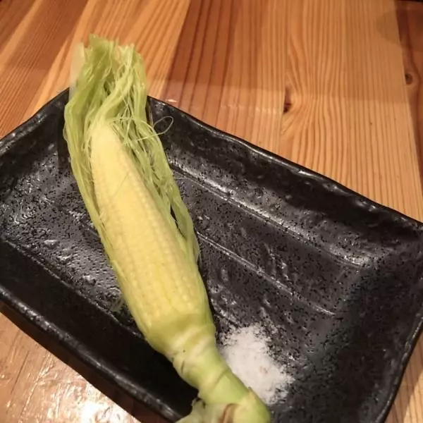 いまが旬のヤングコーンは蒸し焼き状態で登場。ひげもやわらかで、火入れ具合が完璧な実の歯応えもよく、シンプルに塩でいただいたことで甘みが増し増しな印象。