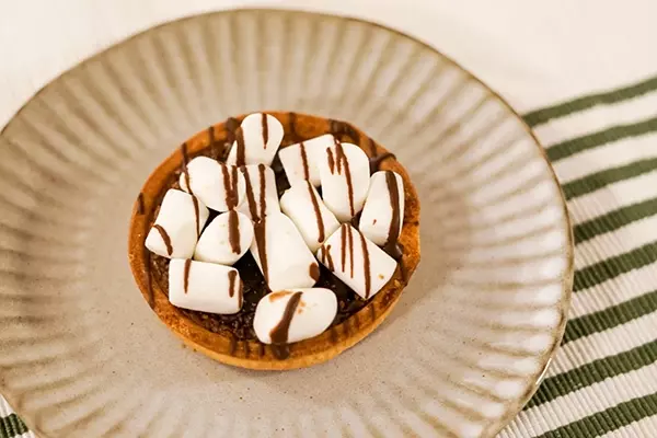 タルト生地のなかに、チョコと小さめのマシュマロが10個以上トッピングされ、さらにチョコソースのようなものがかかっている同商品は、見るからに甘さそう。