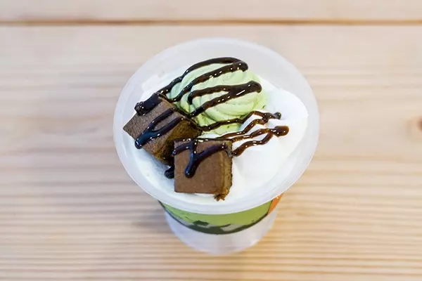 宇治抹茶とほうじ茶を組み合わせた和スイーツで具体的には、抹茶ムースと抹茶ダイスゼリー、スポンジ、白ホイップクリーム、抹茶ホイップクリーム、ほうじ茶ガトーショコラ、ほうじ茶ソースを使用したなんとも贅沢な仕上がりです。