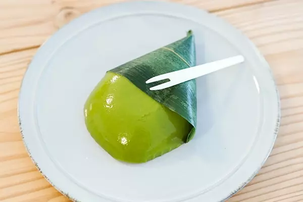 抹茶葛ねりを笹の葉で包んだ香り豊かなスイーツ