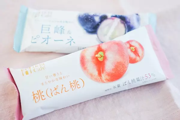 そんなフルーツバーの新作として、2018年7月17日から、数量・期間限定で発売されたのが、「ウチカフェフルーツバーばん桃」と、「ウチカフェフルーツバー巨峰&ピオーネ」(どちらも税込160円)です。