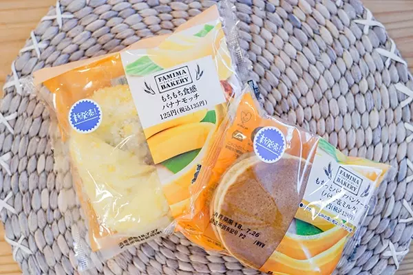 近所のファミリーマートで「バナナモッチ」と「バナナパンケーキ(バナナ&ミルク)」を購入し、実際に食べてみることに。