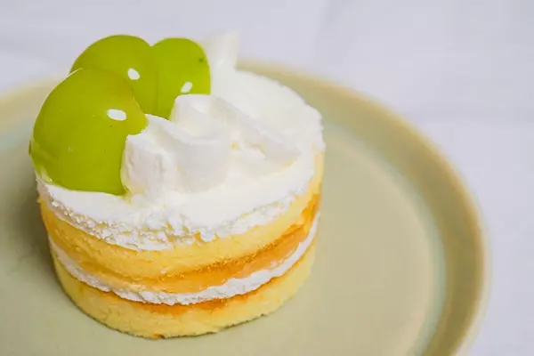 皮ごと食べてもおいしいシャインマスカットをメインに、ふんわりとしたスポンジ生地と白ブドウで風味よく仕上げたソース、北海道産生クリームを使ったブレンドクリームが脇を固めます。