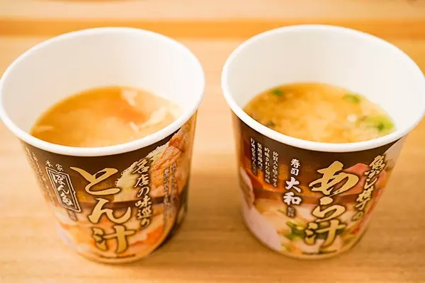 9月25日、ローソンが発売したのが「マルコメ魚がし横丁大和寿司監修あら汁」(税込168円)と「マルコメ名店の味巡りぽん多監修とん汁」(税込178円)の、2つのカップみそ汁です。