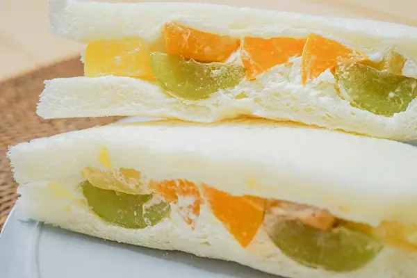 同商品は、シャインマスカットをメインに、パイナップル、キウイフルーツ、黄桃の4種類のフルーツと、ホイップクリーム、ヨーグルトホイップをサンドしたものです。