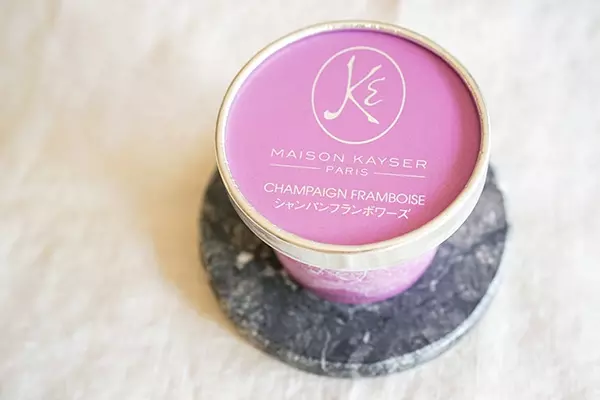 フランス産のシャンパンを使用したシャンパンアイスに、フランボワーズのソースを混ぜ込んだアイスで、フランスでは人気のフレーバーなのだとか。