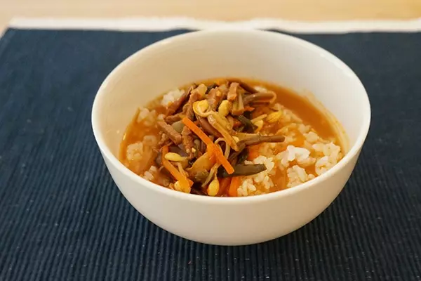 …全体的に茶色い、かつ、肉肉しいなかにおいて、唯一これ単体で色味のバランスと食材のバランスがとれていたことが好印象。ただ、ちょっぴり本格的で辛いので、辛いものが苦手な人は避けた方が良いかも。