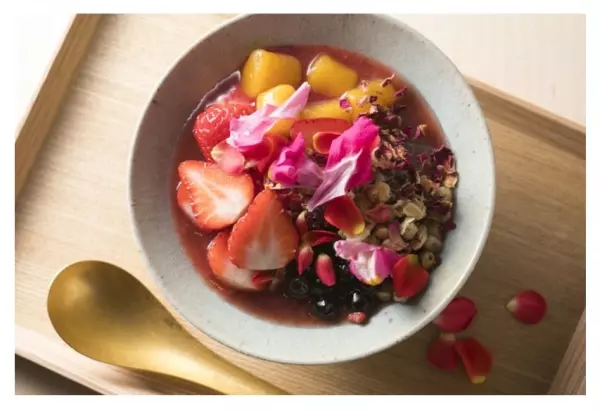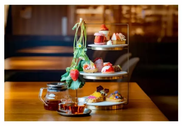 春一色に染まった館内で、春らしいお食事や宿泊を1階の「ERUTAN RESTAURANT/BAR」では、京都産減農薬いちごを使用したアフタヌーンティーセット(3500円)を販売。