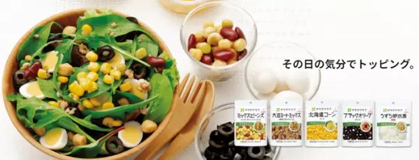 「サラダクラブ 素材パウチ」シリーズは1回使い切りサイズのサラダ素材です。豆やコーン、穀物、ウズラの卵など、素材にこだわった全19種類のラインナップでサラダに彩りをプラス。様々な素材を組み合わせて栄養たっぷりのサラダを手軽に楽しめます。