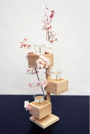 盛りつけにもこだわった日本酒とおつまみ日本酒メニューは枡を縦に積んで桜の花をあしらった「一本桜」や、枡を合わせ絵のように並べた「三連桜」などの見た目にも美しい盛りつけで提供。
