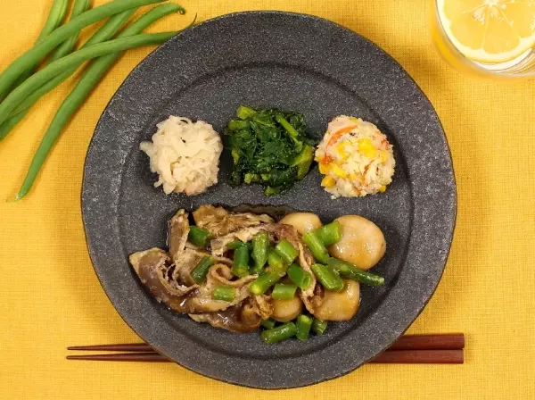 『牛肉と里芋の旨だれしょうゆ』は、大きめサイズの里芋と牛肉をあわせ、醤油味がベースのオリジナルたれで味付けました。副菜は「ツナマヨたまねぎ」「菜の花の胡麻しょうゆ」「とうもろこし入りの卯の花」となっています。