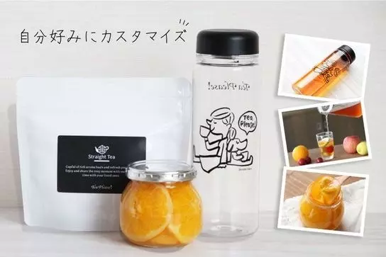 人気デザイナーとのコラボ「カスタマイズティーセット」は、ボトル、フルーツコンポート、水出し茶葉の3点セット。コンポートと紅茶をブレンドして出来上がった紅茶は、軽量エコボトルで持ち運び可能です。