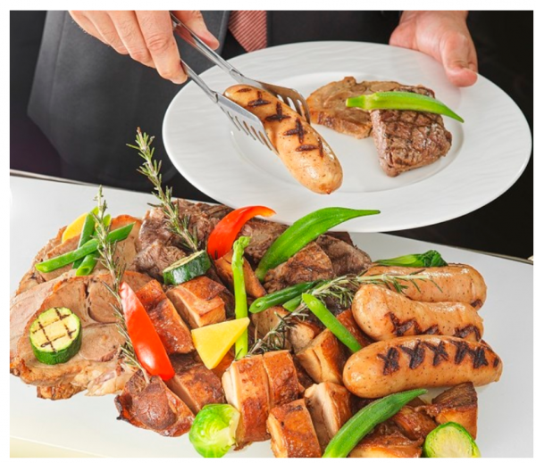 緑と水に囲まれた開放的な空間で、ミートプレート盛り合わせ(牛肉のグリル・鶏肉のグリル・豚肉のグリルまたはソーセージ)、オードブル盛り合わせ、デザート盛り合わせのメニューを楽しめます。