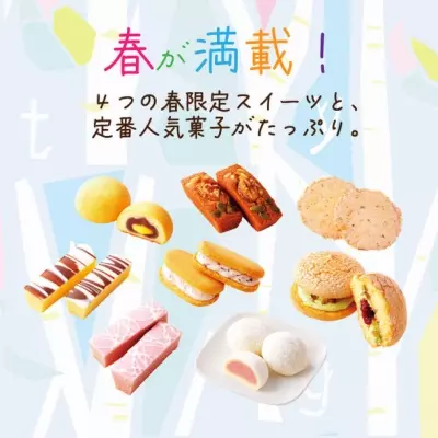 柳月の代表銘菓「三方六の小割いちご」の可愛い苺バウムクーヘンや、新作の「苺のハッピームーン」、「春風のドラサン」「春の桜せん」など、4つの春限定のお菓子をお詰めしました。