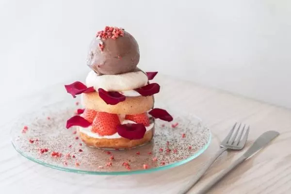 価格は税抜1,500円。素材にこだわったドーナツと「プレマルシェジェラテリア」の濃厚チョコレートジェラート、そして食用バラのコラボレーションを楽しめます。色鮮やかで見た目にも美しいスイーツです。
