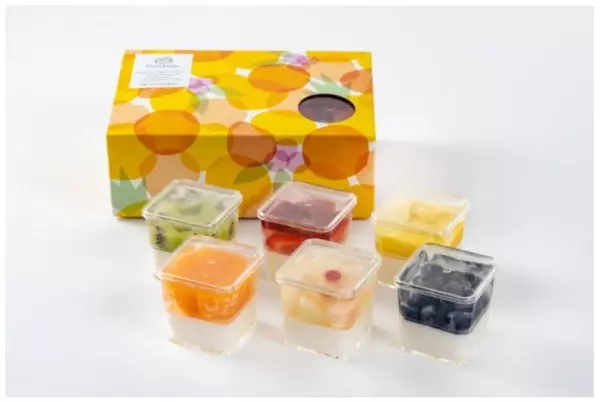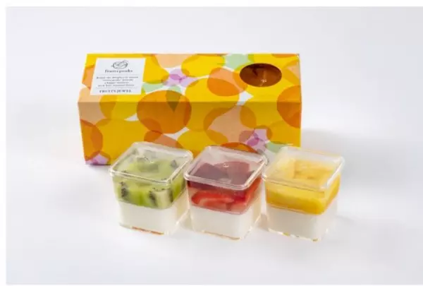 おみやげにも最適なセット販売もあり今回発売される「フルーツジュエル」は、手のひらサイズのキューブ型にクリーミーなバニラムースとジューシーなフルーツ、さっぱりしたゼリーが入ったデザートです。