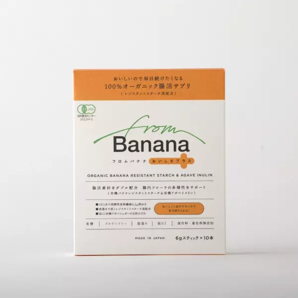 今回新たに登場した「フロムバナナおいしさプラス」は、青バナナから抽出したレジスタントスターチに水溶性食物繊維「有機アガベイヌリン」と、低GIの甘味料「有機アガベシュガー」をプラスしたサプリメント。