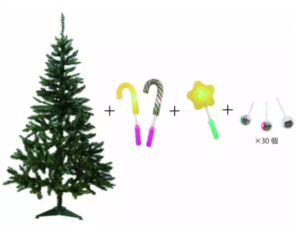 飾って楽しく、食べておいしいアイテムが満載クリスマス気分が盛り上がる「クリスマスツリーセット」は、高さ150センチのツリーに、光るケーンロリポップキャンディ(2本)、光る星ロリポップキャンディ(1本)、オーナメント30個のセット。オンライン販売限定の商品となります。