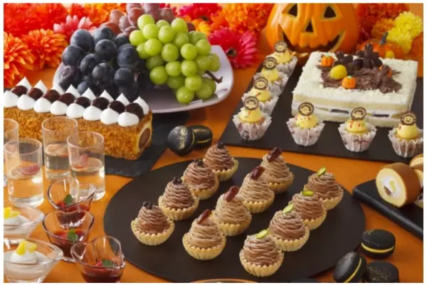 自分で作れるパフェやドリンクも登場「スイーツ&サンドウィッチビュッフェ~栗とぶどうのハロウィーンパーティー~」は、1階の「ザ・ラウンジ」で開催。こだわりの栗ペーストでつくるモンブランやカボチャを使用したスイーツ、2種類のフレッシュぶどうなどをハロウィーンムード一色の店内で楽しめます。