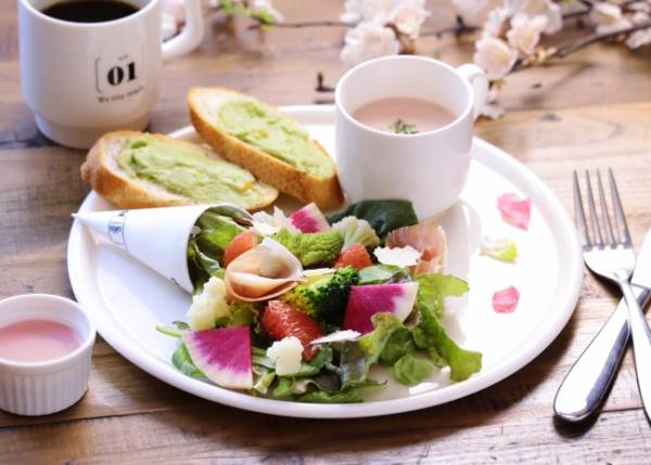 セットについてくるスープも色鮮やかな桜色。ノーザンルビーという、ピンク色をしたジャガイモのスープです。見た目にも楽しくヘルシーなサラダプレートで、一気に春気分が高まります。