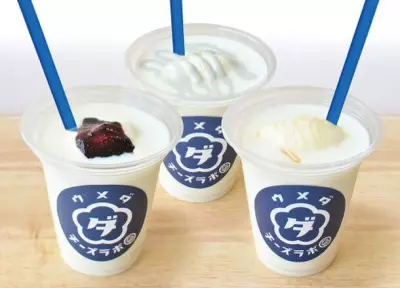 従来の根強い人気である、飲めるチーズケーキ(マスカルポーネとはちみつ/カマンベールとブルーベリー/ゴルゴンゾーラ各種税込650円)の3種類の他に、飲めるチーズケーキ グレープフルーツ(税込650円)/白桃(税込650円)/ほうじ茶とわらびもち(税込750円)の3種類が新登場となります。