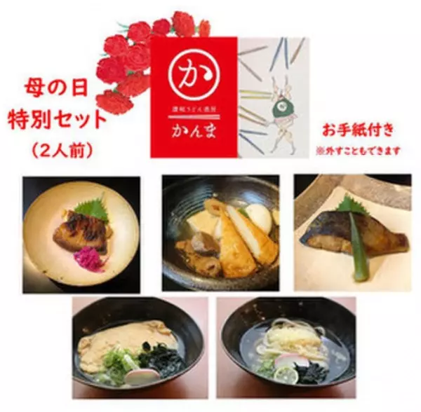 店舗と同じテーブルクロスつきのセットも今回開始した全国クール便配送サービスでは「母の日セット 厳選鮮魚と伊吹いりこの黄金出汁本場讃岐うどん」(3980円)、「きつねとたぬきの巣籠セット」(3980円)「お食事セット」(8000円)などを販売。