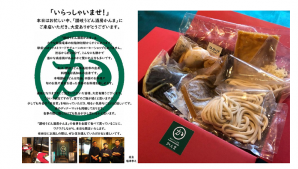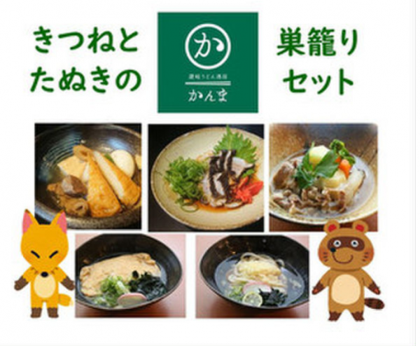 店舗と同じテーブルクロスつきのセットも今回開始した全国クール便配送サービスでは「母の日セット 厳選鮮魚と伊吹いりこの黄金出汁本場讃岐うどん」(3980円)、「きつねとたぬきの巣籠セット」(3980円)「お食事セット」(8000円)などを販売。