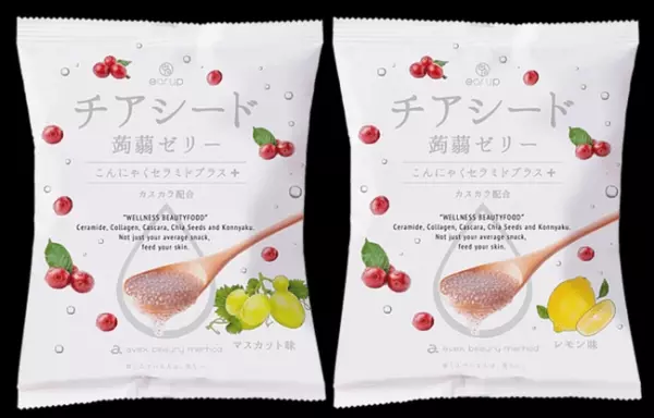 こだわりの素材で美をサポート「チアシード蒟蒻ゼリー こんにゃくセラミドプラス+」は、美と健康をサポートする“美おやつ”。中性脂肪や悪玉コレステロールを減らす効果があり、腸活に欠かせない食物繊維を豊富に含むチアシードは、より栄養価が高い白チアシードを使用しています。