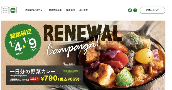 「野菜を食べるカレーcamp」新橋店では、2021年1月4日から2021年1月9日までリニューアルキャンペーンを実施。
