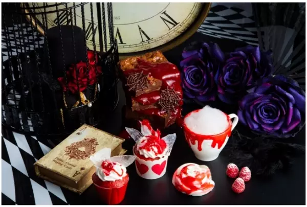 栗と梨のやさしい甘みが口に広がる「ヘンテコ帽子屋のマロンケーキ」、巣穴に飛び込むウサギの姿を模した「モフモフシッポムース」、懐中時計をかたどった「狂った時間のお茶会ケーキ」など、物語の世界観を楽しめるメニューが登場します。