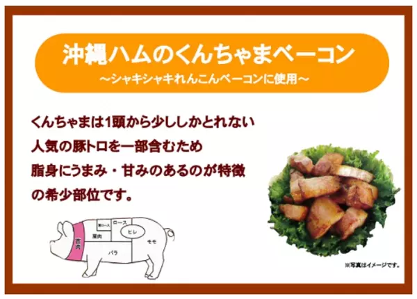 「シャキシャキれんこんベーコン~からしマヨ風味~」(230円)は、脂身の旨みと甘みが特長の「くんちゃまベーコン」を使用。