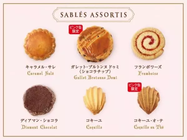 ピンク缶だけの限定2種数種類のクッキーが一度に楽しめる人気のアソート缶。今回発売されるのは、上品なほんのりピンクの限定色です。