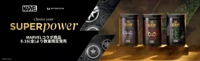 マイプロテインの人気商品「クリアホエイプロテイン」からは、超人的な力と壁に張り付く能力を誇るスパイダーマンにインスパイアされた<ラズベリー&ストロベリーフレーバー>、驚異的な筋力と耐久力を持つハルクにインスパイアされた<ウメ&キウイフレーバー>、そして俊敏性を兼ね備え世界平和のために戦うブラックパンサーにインスパイアされた<ブルーラズベリーフレーバー>が誕生しました。