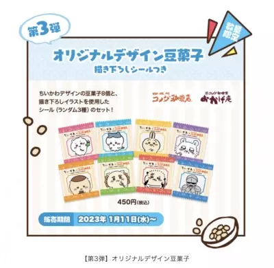 ちいかわのイラストが描かれた豆菓子8個とオリジナルシール(全3種ランダム)1シートがセットになった「オリジナルデザイン豆菓子セット」を販売します。