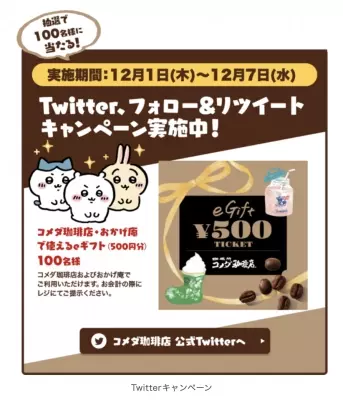 期間中にコメダ公式ツイッター(@KomedaOfficail)をフォローし、対象のツイートをリツイートすると抽選で100名様にコメダ珈琲店・おかげ庵で使えるeギフト券(500円分)が当たります。