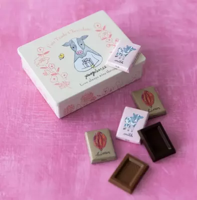 すべすべ手ざわりのいいイラスト缶入りのひとくち板チョコ。粗糖を使ったミルクチョコと、カカオ分61%のビターチョコが7粒ずつ、かわいいイラストつき個包装。