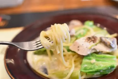 「春野菜とチキンのもちっとおいしいクリームソース」は、濃厚なクリームソースと共に春キャベツやアスパラの旬野菜やマッシュルーム、柔らかく蒸した鶏肉が、もちっとおいしいスパゲッティと合わさったコク深い味わいでした。