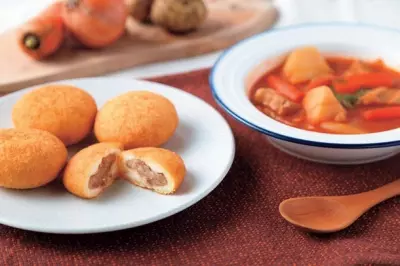 玉ねぎ・お肉(牛・豚)・春雨などの具材はたっぷりで、ボルシチと一緒に食べても飽きがこないようにやさしい味わいに進化。