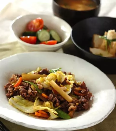 今日の献立は「牛肉と春キャベツのオイスター炒め」