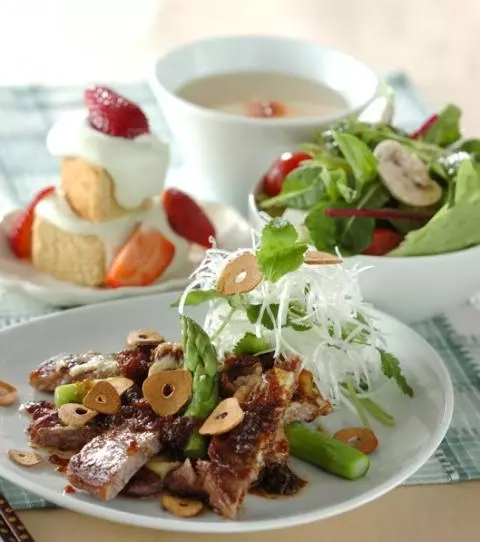 ステーキはワサビマヨをぬって和風に。ジャガイモのスープは濃厚な味わい。