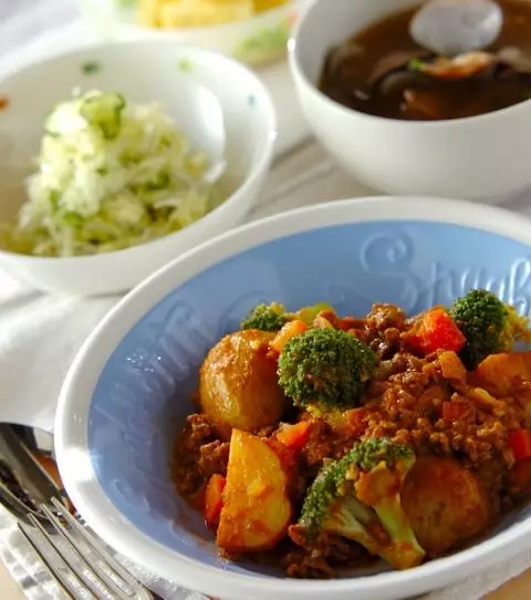 今日の献立は「新ジャガのカレー煮」を含めた全4品。