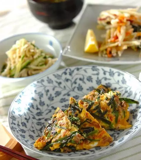 たっぷりニラが入った卵焼きは栄養バッチリ! お弁当にもオススメ。