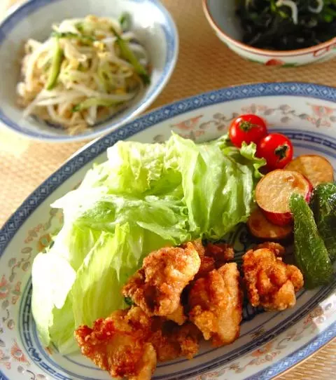 みんな大好き鶏の唐揚げは、シンプルな味付けで! 副菜は酢の物やお浸しでアッサリ、ヘルシーに!