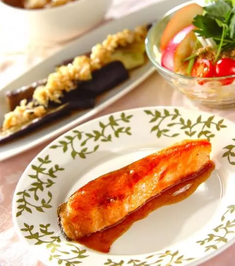 サーモンのバターソテーはソースにレモン汁を加えるのがポイント。みそ汁は具がたっぷり!